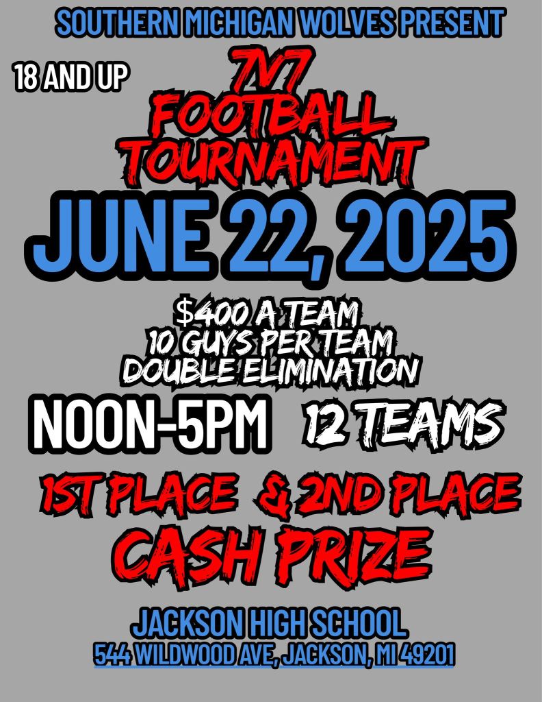 Southern Michigan Wolves are hosting a 7 VS 7 tournament in Jackson Michigan on June 22nd. Click here to Register :7 vs 7 Team Registration Form